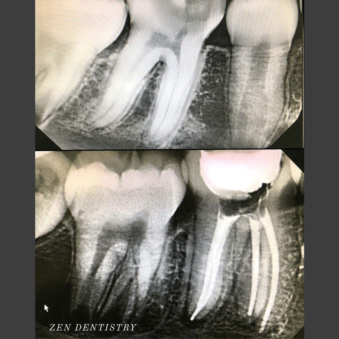 Patient presented to the office with trauma to front two teeth several weeks ago causing her severe pain. After a thorough clinical exam which included endodontic screening and proper x rays led to the diagnosis of necrotic (dead) pulp tissue due to the force of trauma.